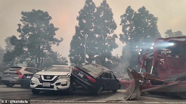 From 2500 feet, the KCAL 9 helicopter circles above Sunset Blvd, choked with honking cars. When a Mercedes G Wagon breaks down and blocks traffic, a (mostly) orderly retreat devolves into a rout. People abandon their vehicles and flee on foot. The news cameras pan across an endless vista of abandoned cars, a stock shot pulled from an alien invasion movie. To reach the fire, the LAFD uses an industrial plow to knock vehicles off the road like so many discarded toy cars.
