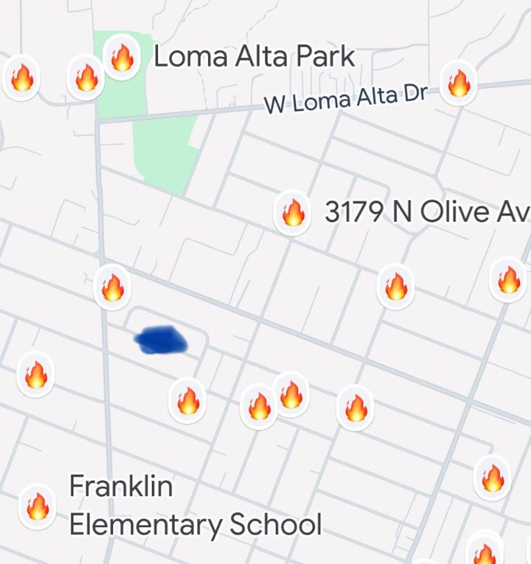 The Ring App hosts a panicked message board for West Altadenans, endless variations on: “Anybody know if Mariposa between Lincoln and Fair Oaks is OK?” Replies are mostly prayer hands emojis and question marks. As 11 p.m. bleeds into early morning, late evacuees offer ominous updates. Purported eye-witnesses swear they saw local businesses burning—Unincorporated Coffee, Amara Cafe, the B of A on Lake. Other neighbors demand pictures as proof, suggesting—hoping—that the rumors are just trolls stoking panic. That level of misanthropy seems hard to imagine. But I’m also struggling to believe police scanner reports of widespread looting, demons in balaclavas ransacking burning houses.