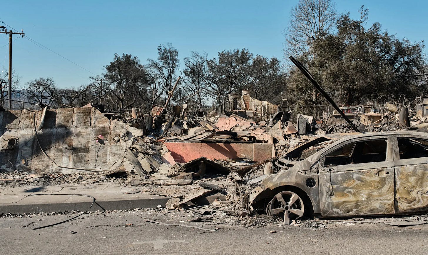 Our mayor—who literally ran on not traveling abroad—was at a cocktail party in Ghana when the fires started. Her opponent in the mayoral election—self-anointed 'common sense' warrior and champion of the landed gentry, Rick Caruso—spends hours on TV criticizing her leadership, then sends his tenants a letter: rent recommences in 60 days.