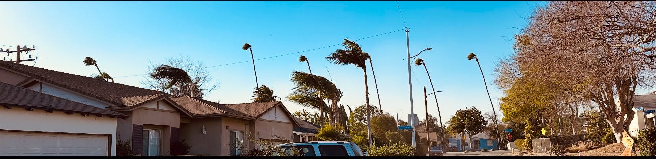 The next morning, feeling like a surfer stuck at the office during a legendary swell, I ask Lo to watch Felix so I can put my face in the wind. I walk down Glen, across Harriet, and head up Fair Oaks, past the Life Church of the Nazarene and the Cash Only dispensary with the hostile budtenders. The wind is fantastic, twisting bushes and rattling the dry pepper trees. It smells like asphalt and sagebrush and the acrid foothill dust. Cars slalom plastic trash bins that have blown into the streets; my thinning hair whorls into a wispy bouffant; Altadena’s ubiquitous inflatables—giant candy canes, jumbo Nutcracker soldiers, teams of sleigh-pulling reindeer—tip and topple, flail and flutter. The palm fronds whipped flat against the sky remind me of the Blown Away Guy in that famous Maxwell Cassette ad: his hair, his tie, even the lampshade pinned back by the force of sound.