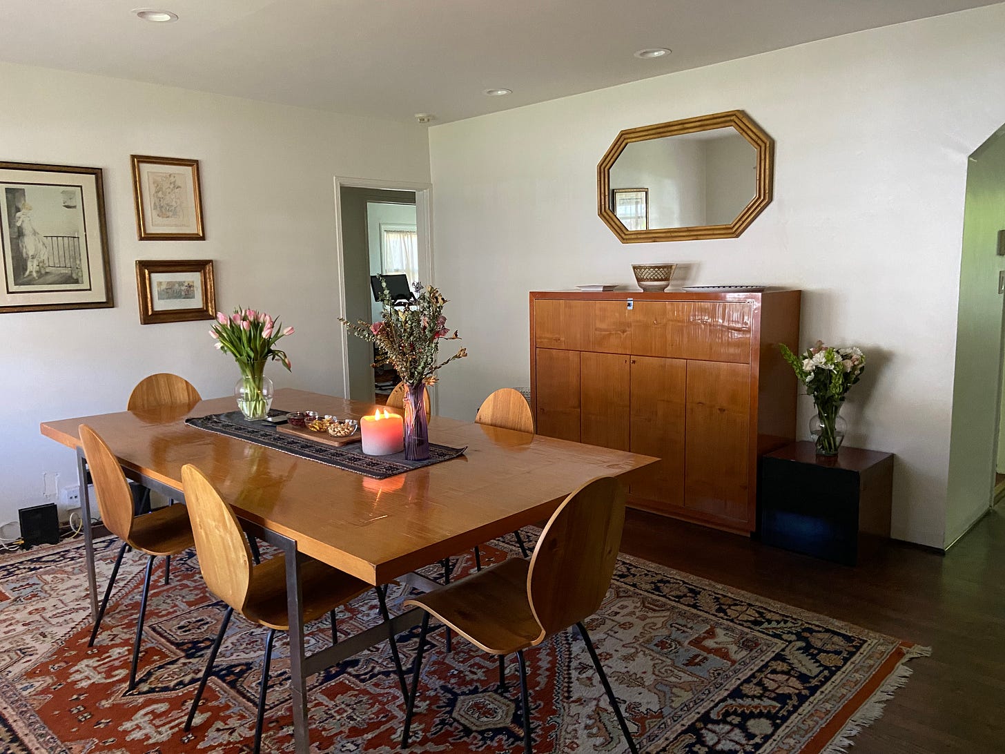Our Altadena house was a patchwork: part Tel Aviv chic, part Hungarian card room. The lacquered bamboo sideboard (on long-term loan from my mother-in-law) faced the frayed Oriental rugs and the stern leather club chairs with brass nailhead trim, both inherited from my grandparents. Those heirlooms—along with a set of teak cabinets my Grandpa Gabi built and a dozen nearly identical charcoal sketches of shtetl streets, all in ornate gilt frames—had gathered a decade of dust in a Connecticut storage facility before Lo arranged to have it all shipped West. I was surprised by how good that stuff made me feel—familiar, quietly reassuring. Maybe I’d spent so long performing the “more cultural than religious” version of modern Jew that I’d forgotten I am, in fact, pretty Jewish—raised by Central European refugees, steeped in a decor language of dark wood, heavy drapery, and glass ashtrays.