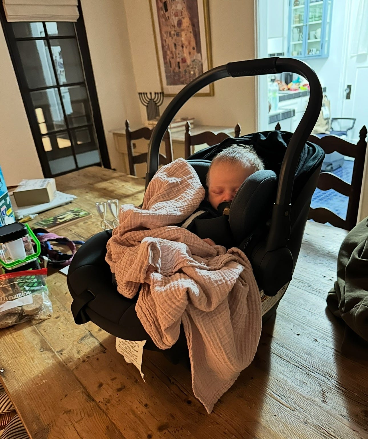 Our friends had organized a meal train after Felix’s birth. It’s a bougie bounty of Erewhon readymades and Milkfarm cheese, and I can’t stomach the thought of it all spoiling while we’re gone. So I salvage the kale salad, the giant white beans, the spicy yams, the artisanal beef jerky, and the Swiss chocolate peanut butter cups.
