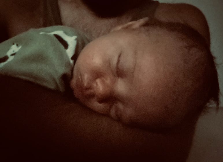 But, sort of like that detective, the co-sleeping finger-waggers leave out a crucial detail: the drugs feel so, so good. In his first month, Felix has never slept more than two hours at a stretch. Tonight, his tiny hand cups my cheek, head tucked between pec and biceps, and our breathing syncs as he drifts into a deep slumber. He snores, weakly tapping my chest like the world’s smallest drunk emphasizing a point before last call. It’s intimate, it’s mammalian: it lasts almost 5 hours.