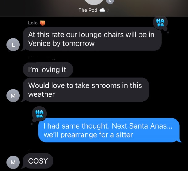 I’m not entirely comfortable admitting that the chat’s cutesy name is “The Pod ☁️,” or that wind is our acknowledged favorite element… let alone that I have a kind of personal cosmology built around its mystic qualities. Start telling people that the wind carries coded ancestral messages, and some pedant invariably says, “Sounds like you got stoned and went for a walk in the wind.