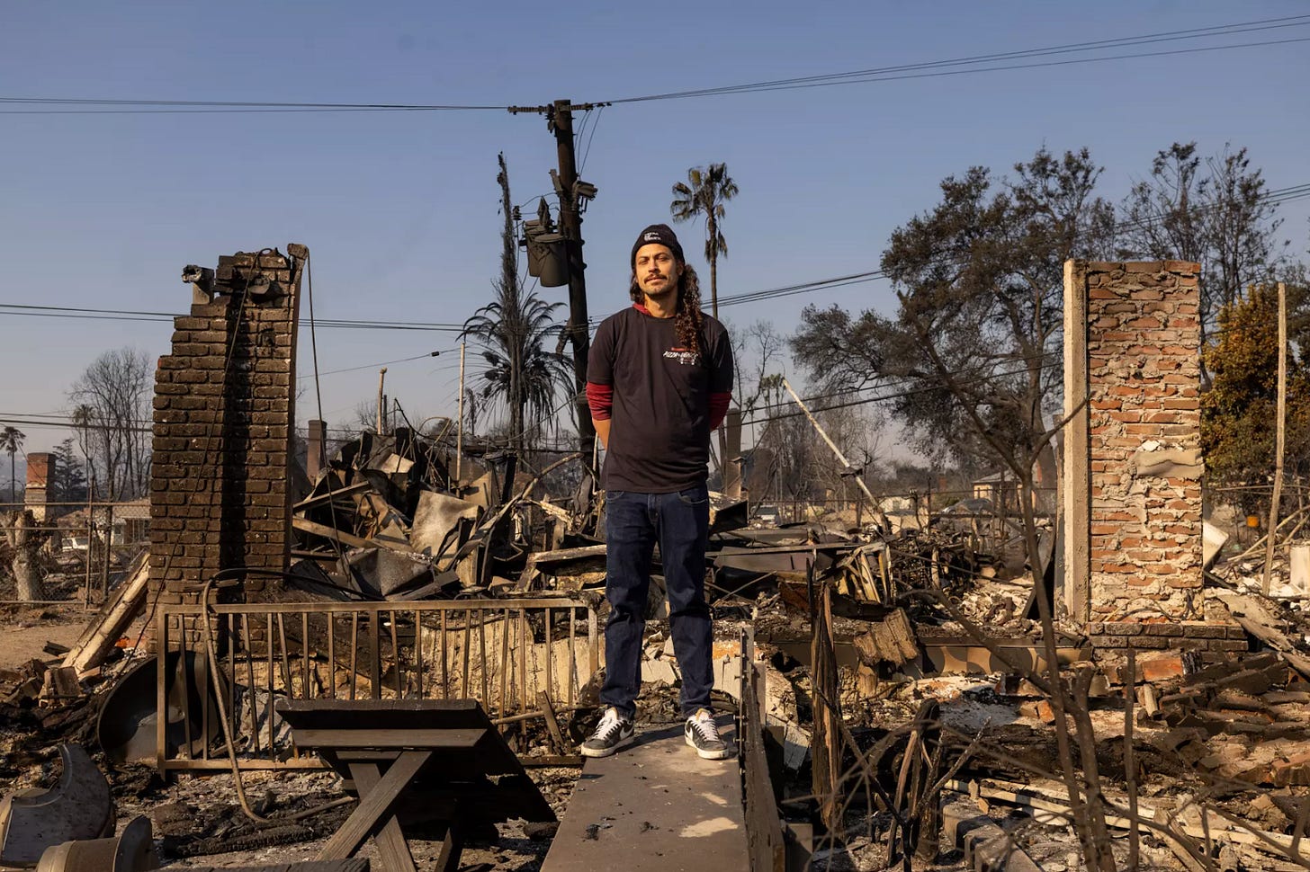 The Palisades Fire incinerates 6,000 homes. Firefighters call for reinforcements that never arrive. The area reservoir is offline for maintenance. Hydrants run dry. As a last resort, firefighters fill buckets with chlorinated pool water. My brother-in-law’s childhood home burns. Every possession that belonged to—and evoked—his late mother is lost. Mark and Claire, newly married, lose their house before finalizing their insurance policy; Phoebe’s store survives, but sprinklers ruin the merchandise. Her customers are displaced.