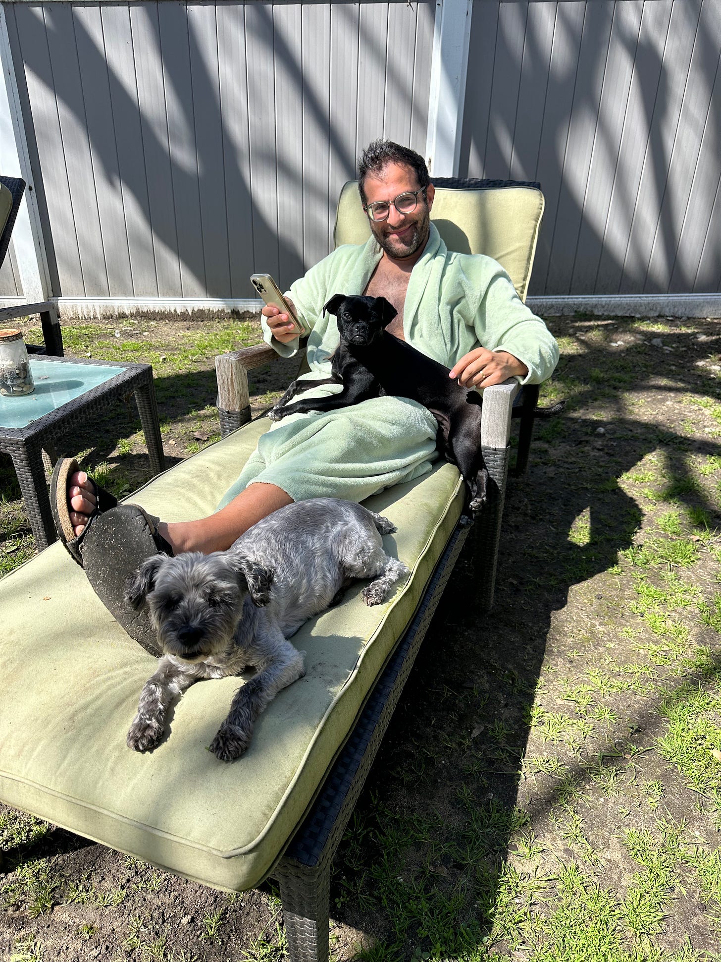 For a small pool-less backyard, the chaise loungers were ridiculous, aspirational—and perfect. We used them every day: coffee and crosswords, lounging with the dogs, backgammon by the fire pit, breakfast in bathrobes. I’d take an edible and squint up into the leaves of the giant Black Walnut tree—a contained ecosystem of squirrels, green macaws, black crows, even hummingbirds. We had arranged the loungers in a horseshoe around the yard, four, four, and four. You could move clockwise from one to the next, staying perpetually shaded as the sun circled the sky.