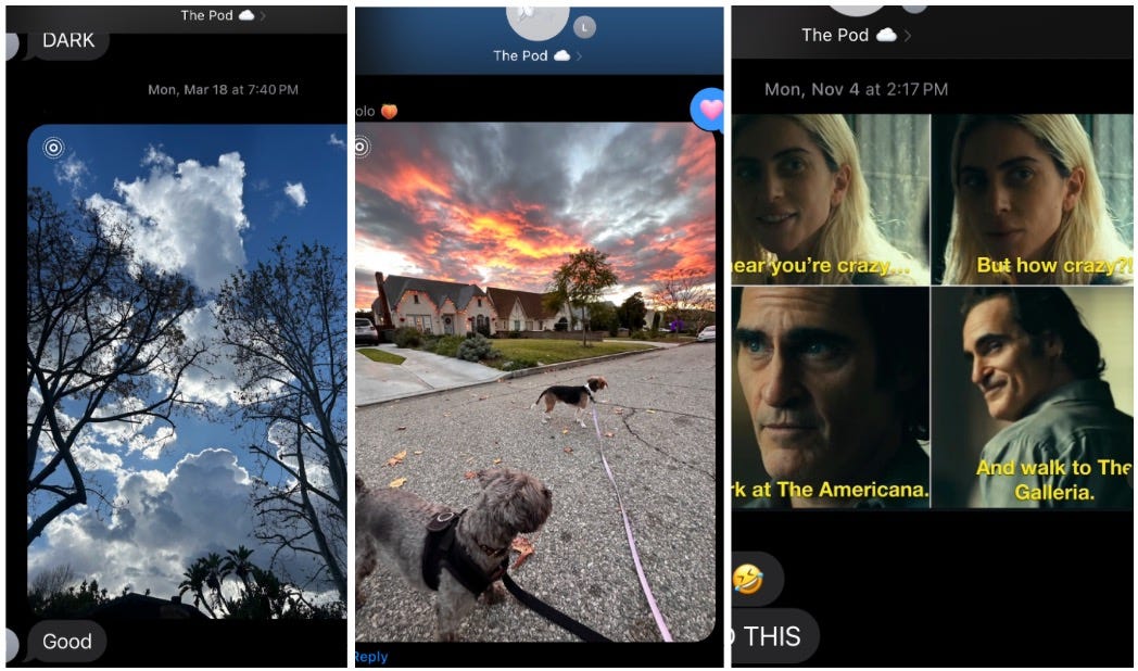 Lo and I have a group chat with our friend Margot, devoted, in large part, to screenshots from the Americana at Brand meme account and pictures of unusual clouds.